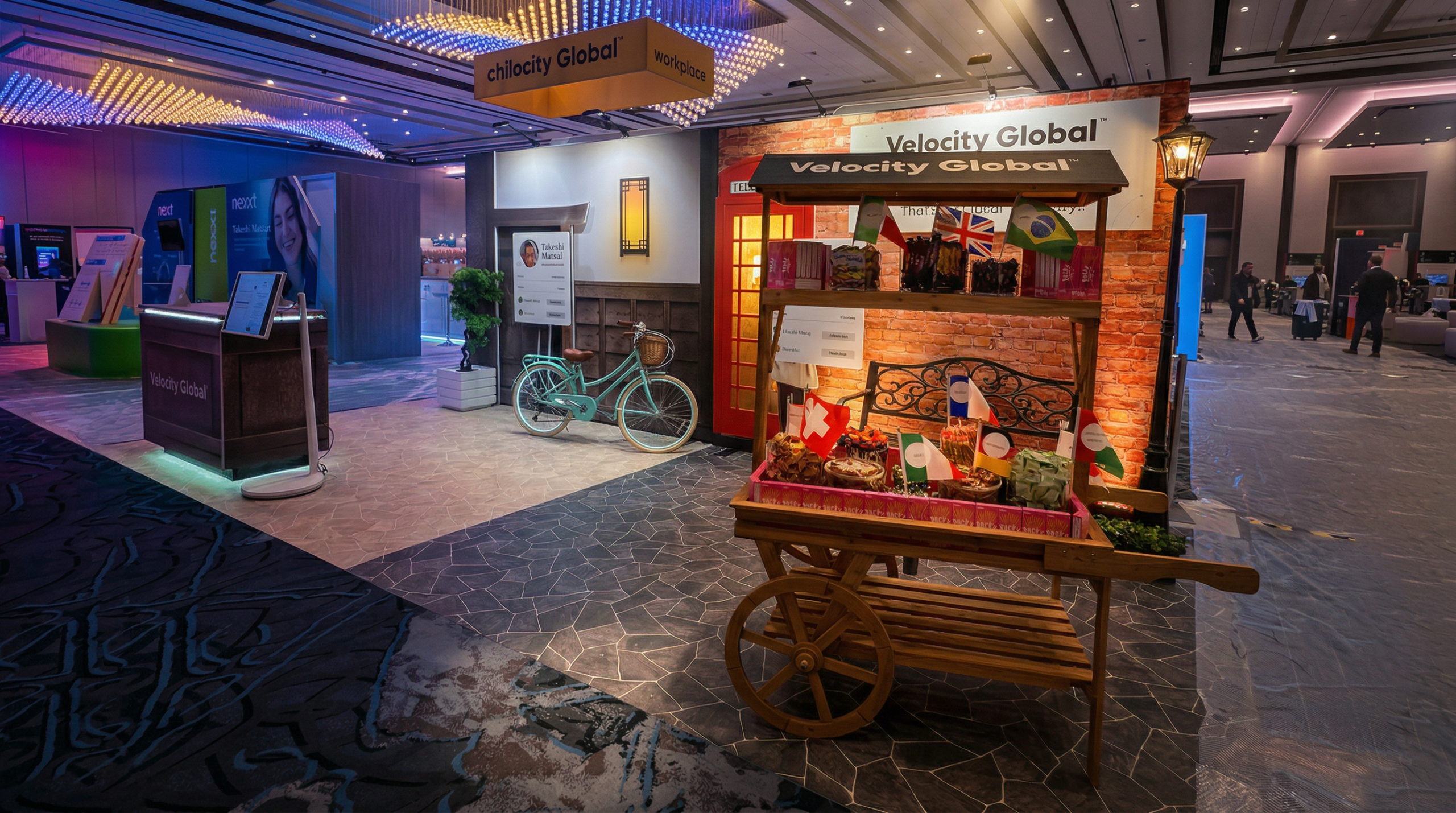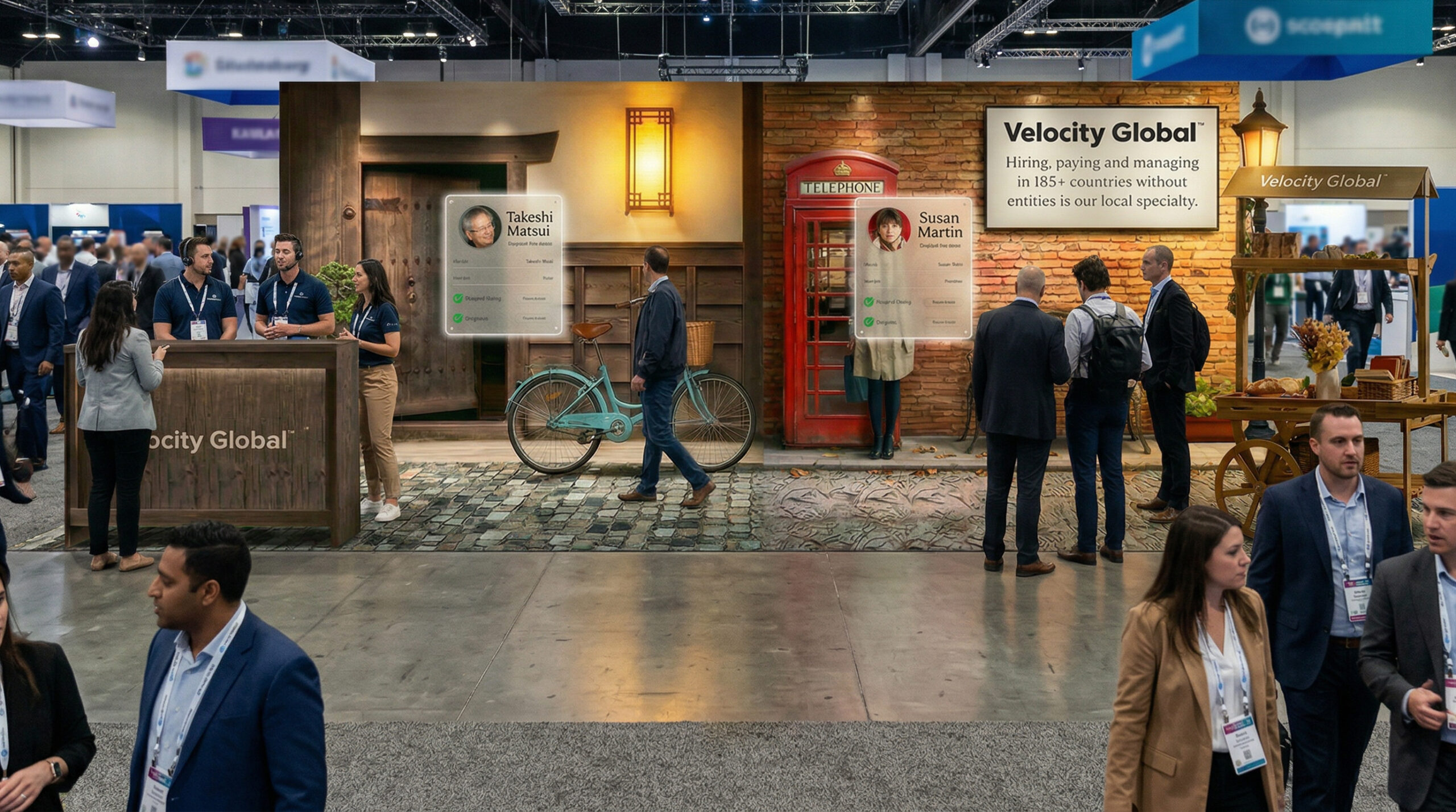 SOLUTION: We designed an immersive booth that visually expressed Velocity Global’s worldwide reach. The space was cleverly split into two global scenes; one a Japanese streetscape, the other a rainy London setting, symbolizing the range of markets Velocity Global enables companies to operate in. The walk-through environment transformed global hiring into a tangible experience, reinforcing the brand’s promise of managing talent anywhere in the world without entities.