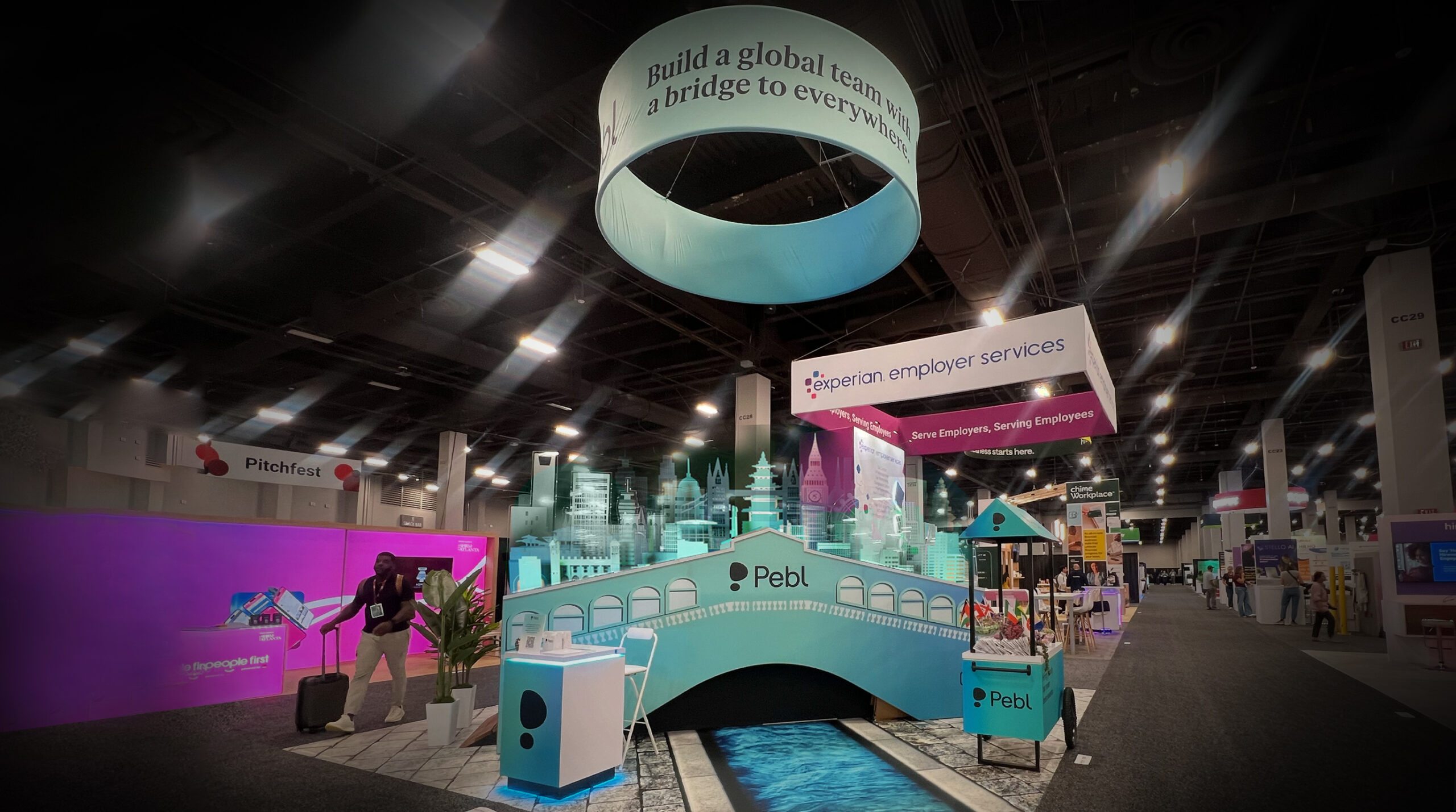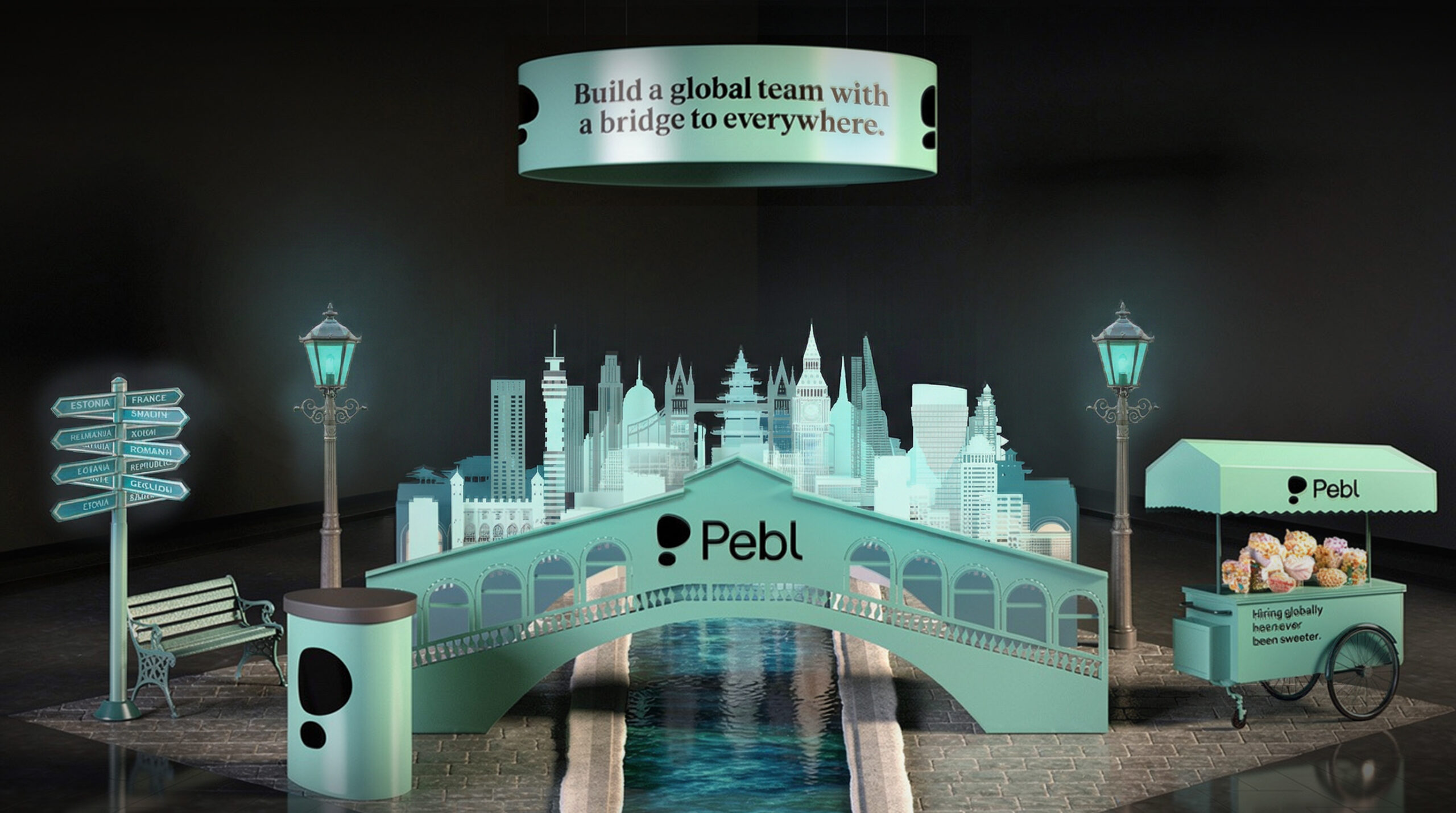 SOLUTION: Engine designed a dramatic bridge-inspired booth symbolizing the connection between Pebl and global talent. Crafted in translucent aquamarine blue, the structure featured railings illustrated with iconic world city landmarks, creating a striking visual metaphor for Pebl’s ability to bridge borders. The bold architectural centerpiece became a show-stopping booth.